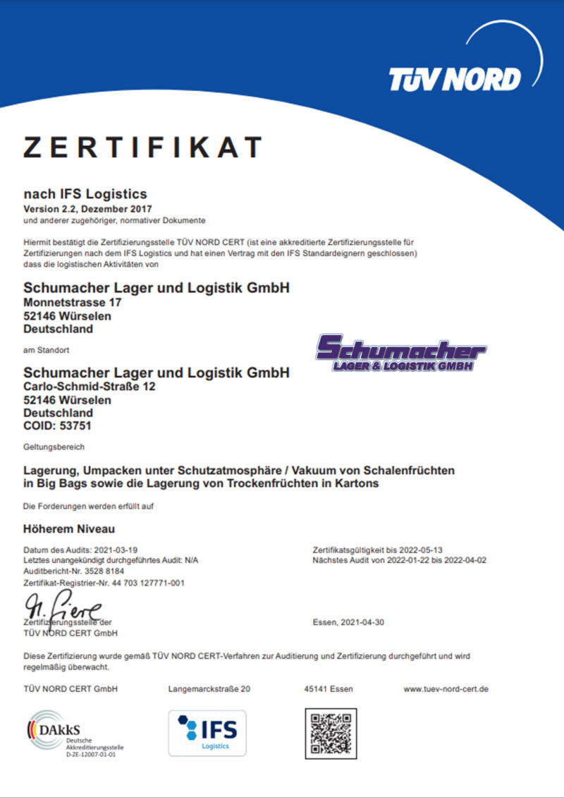 We are very pleased that, thanks to our reliable and committed employees, we meet the requirements of certification according to IFS Logistics 2.2, in the area of storage, repacking under a protective atmosphere/vacuum of nuts in big bags and the storage of dried fruits in boxes, at a higher level .
