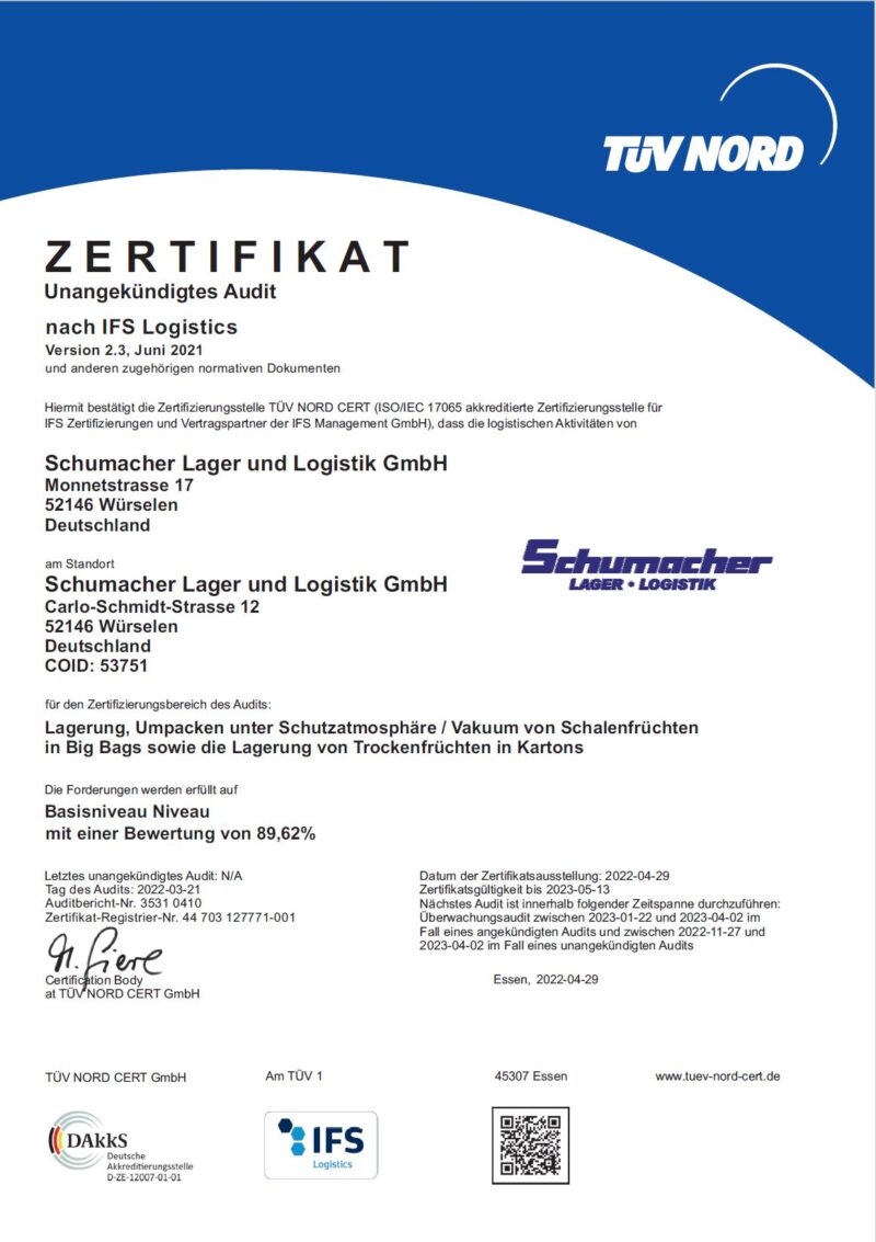 We are very pleased that, thanks to our reliable and committed employees, we meet the requirements of certification according to IFS Logistics 2.3 in the area of storage, repacking under a protective atmosphere/vacuum of nuts in big bags and the storage of dried fruits in boxes.