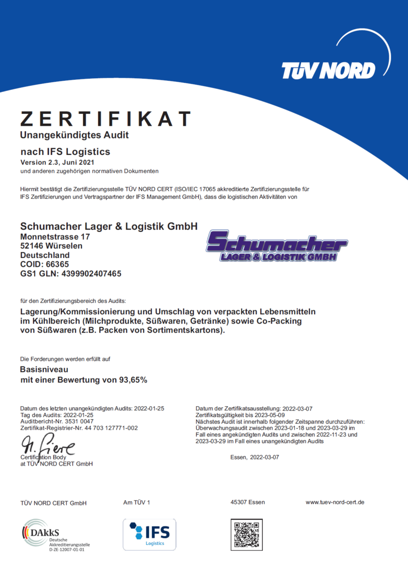 Die Schumacher Lager & Logistik GmbH hat auch in diesem Jahr wieder erfolgreich eine Zertifizierung nach dem IFS Logistics Standard abgeschlossen. Der Standard gilt für Unternehmen, die Logistikdienstleistungen wie Transport und Lagerung von Waren anbieten und stellt sicher, dass die Anforderungen an die Lebensmittelsicherheit eingehalten werden.