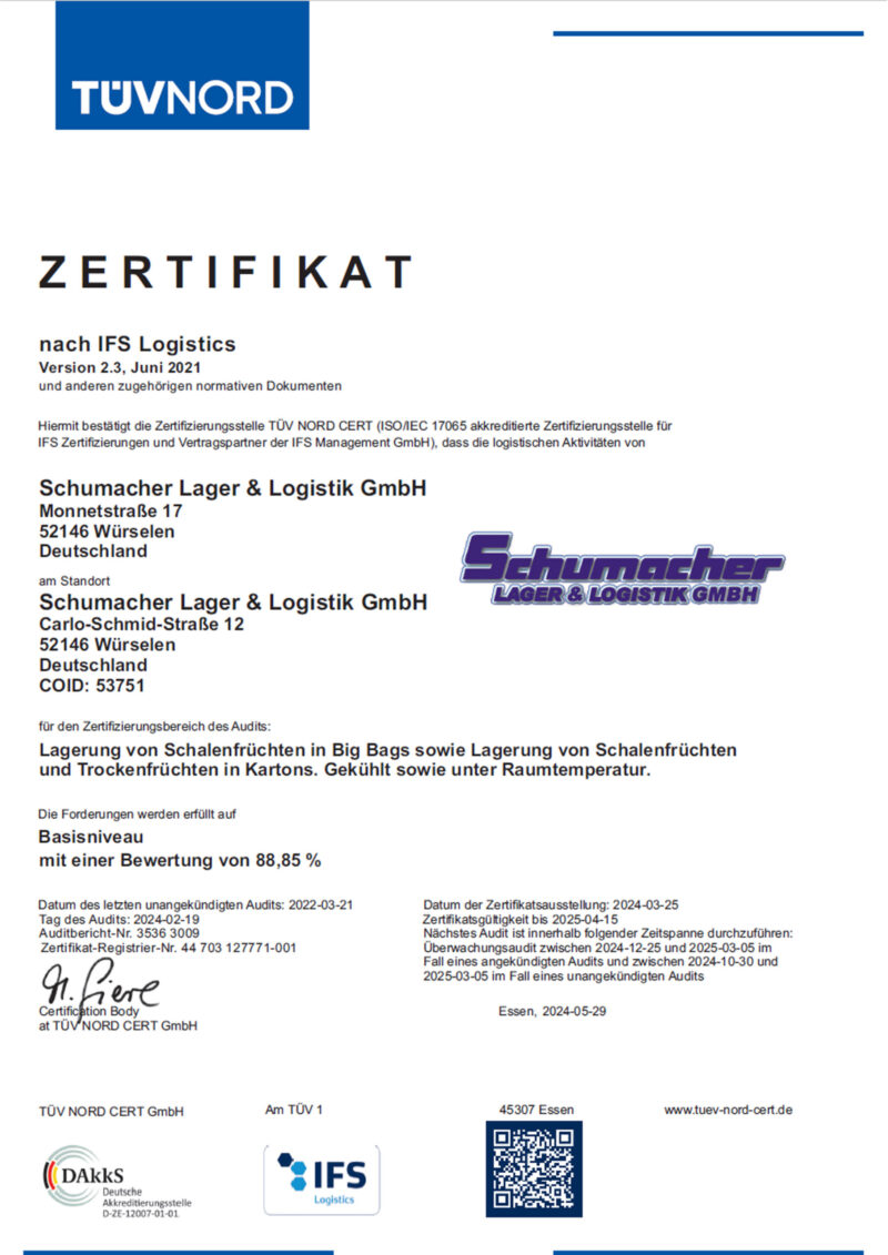 Dank unserer hochmotivierten und zuverlässigen Mitarbeiter sind wir stolz darauf, die Anforderungen der IFS Logistics 2.3 Zertifizierung für die Lagerung von Schalenfrüchten in Big Bags sowie die Lagerung von Schalenfrüchten und Trockenfrüchten in Kartons, gekühlt und Raumtemperatur geregelt, an unserem Standort in der Carlo-Schmid-Straße 12 in Würselen, erfüllen zu können.